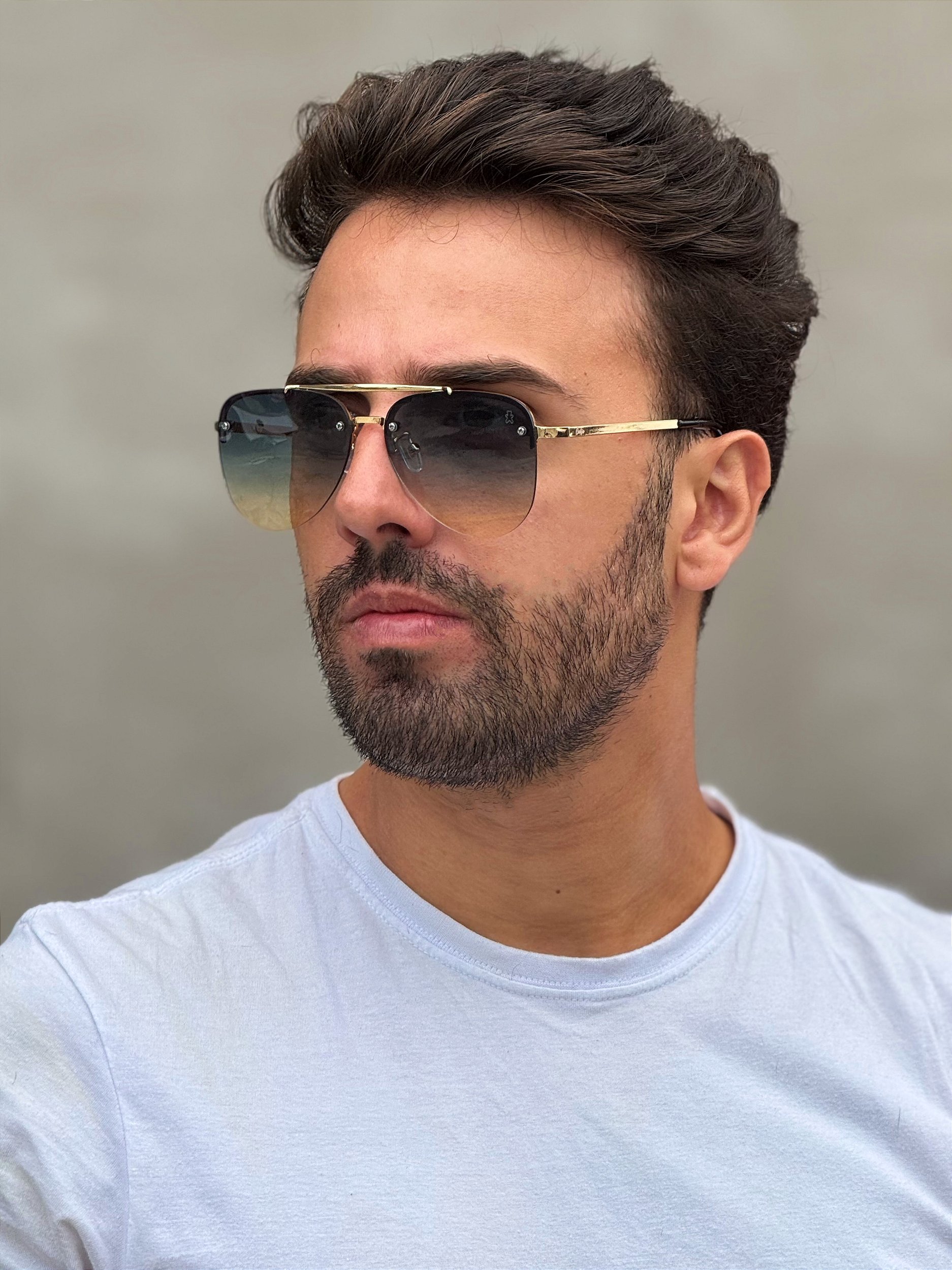 Um modelo formato aviador, com lentes infinitas, sua armação é toda em metal anticorrosivo, por ser nesse formato, ficam perfeitos em rostos quadrados e ovais, deixando assim muito mais harmonizado , por ser um formato versátil, tambem combinado com quase todos os tipos de rostos.